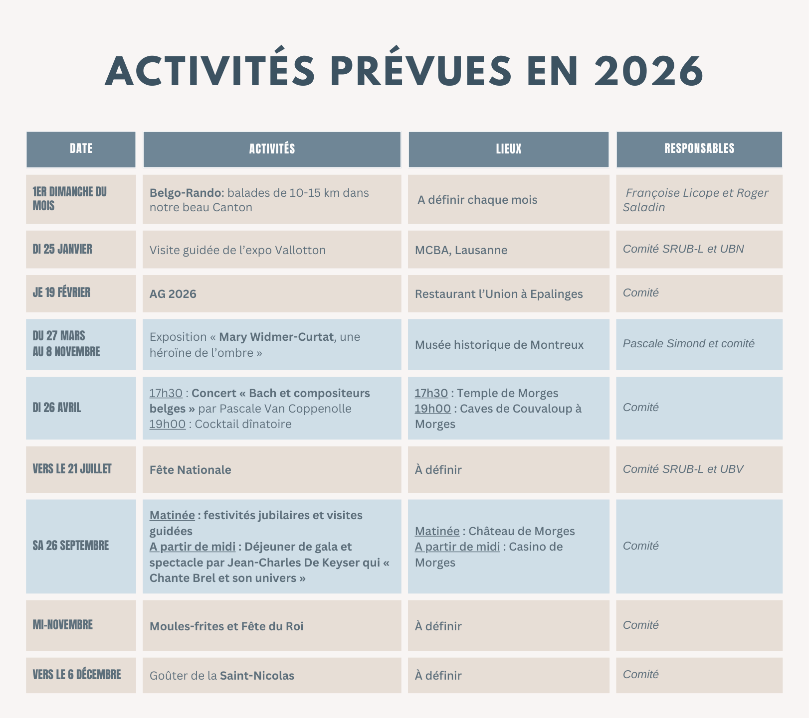 *Sur fond bleu: activités du centenaire. Plus d'informations sur