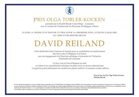 Jeudi 12 mai 2022 - Remise du Prix Olga Tobler-Kocken à David Reiland