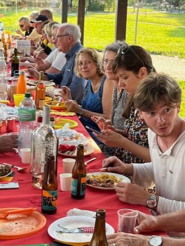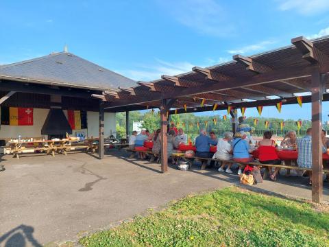 Le 19 juillet 2024, une belle quarantaine de membres de l’Union belge du Valais et de la SRUBL se retrouve à Corsier-sur-Vevey pour fêter notre pays dans la bonne humeur avec une météo fantastique. Pas de drache nationale… Drapeaux des deux Unions, fanions, portrait royal, décoration noir, jaune, rouge jusqu’aux toilettes des dames et la brabançonne trilingue ont créé une ambiance festive autour d’un barbecue arrosé de champagne, bières belges et vins. Tous ont mis la « main à la pâte » en apportant des plats originaux et exquis allant de l’apéro, aux salades et pour finir des desserts gourmands. Une soirée mémorable dont témoigne la galerie de photos.